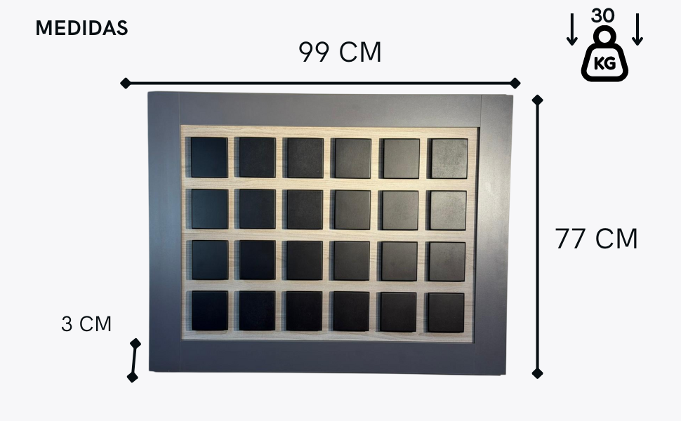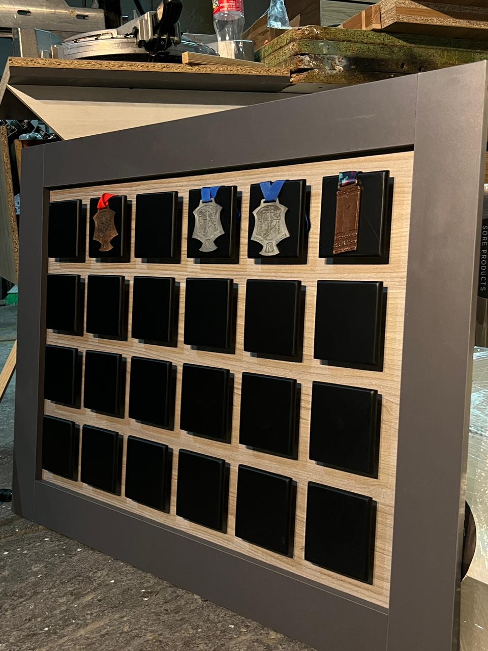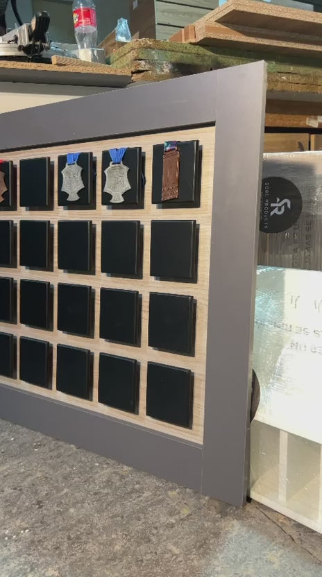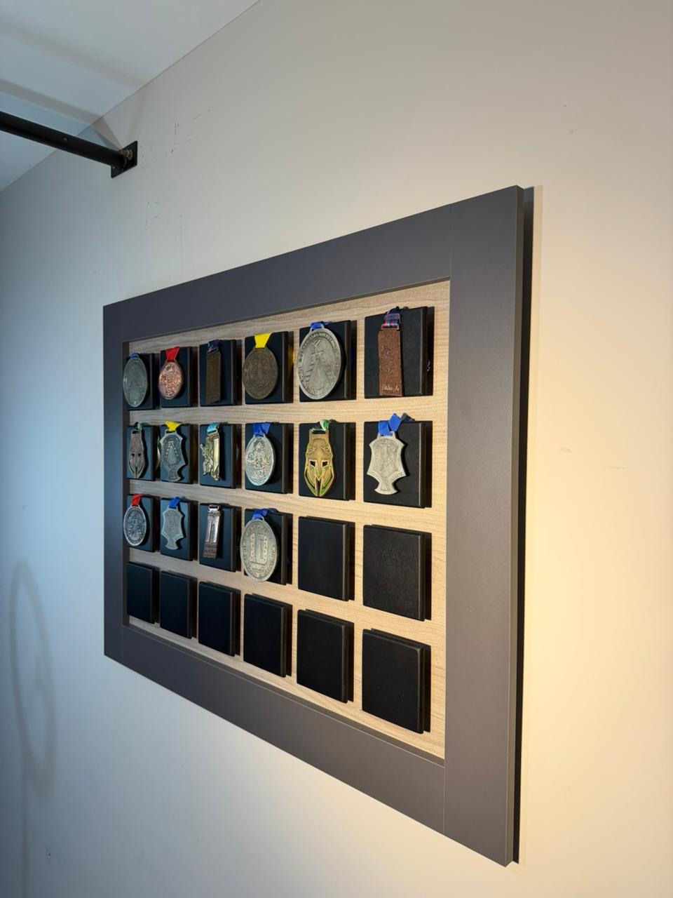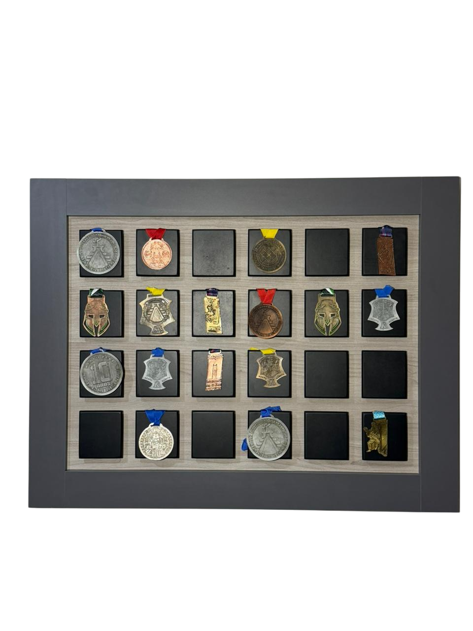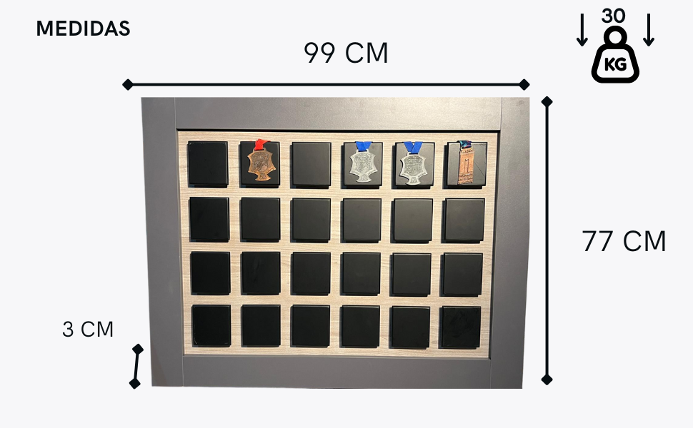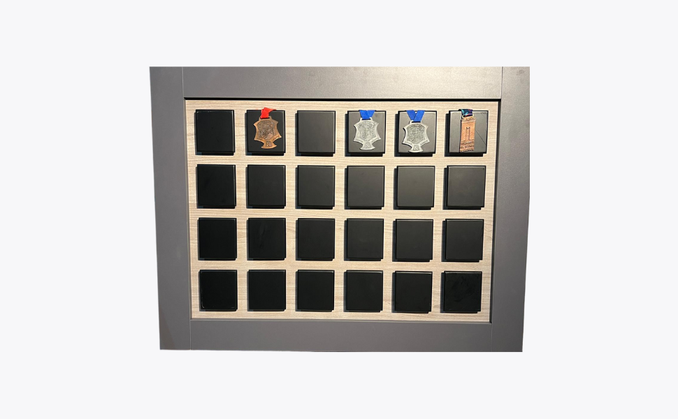 Ideal para exhibir y organizar tus medallas favoritas. Su diseño práctico y vistoso te permite colocar hasta 24 medallas, manteniéndolas visibles, ordenadas y listas para presumir tus logros. Perfecto para atletas, academias deportivas o habitaciones personales, este medallero se convierte en un recordatorio motivador de cada victoria alcanzada.